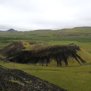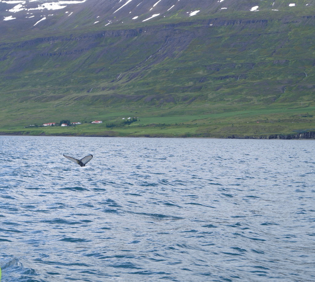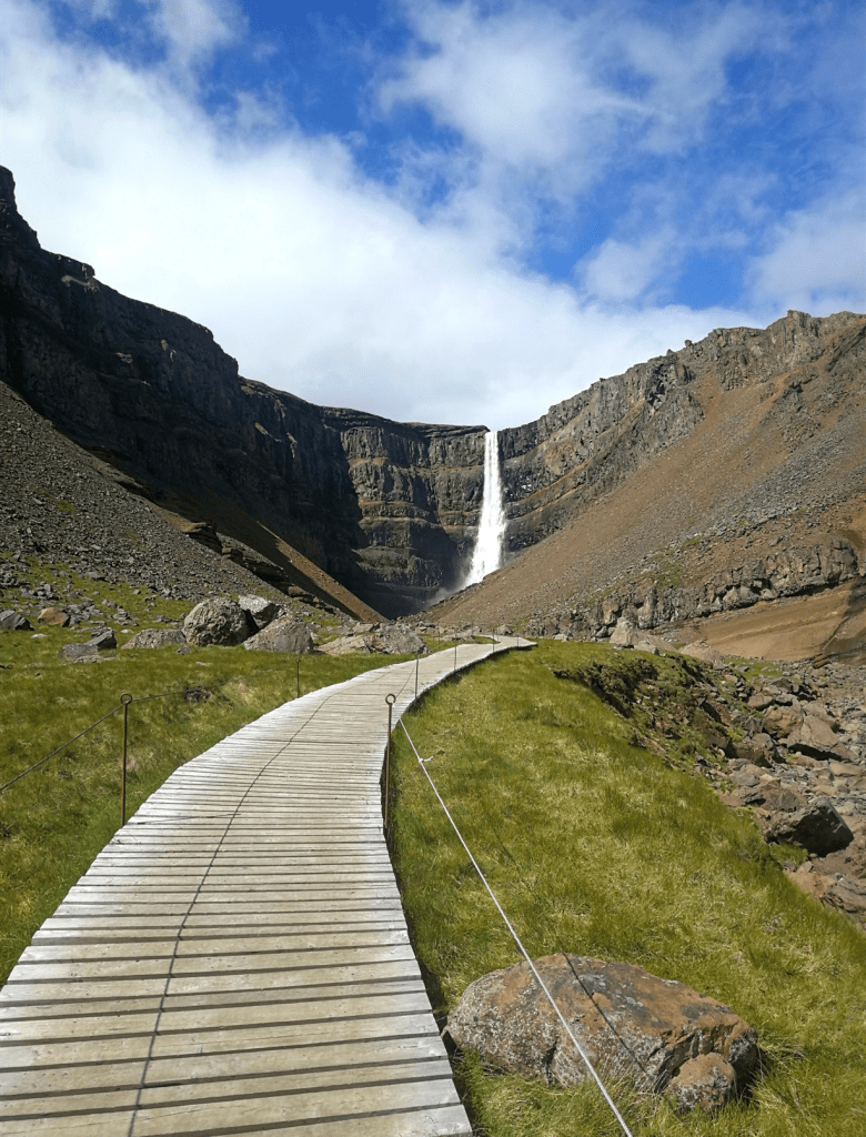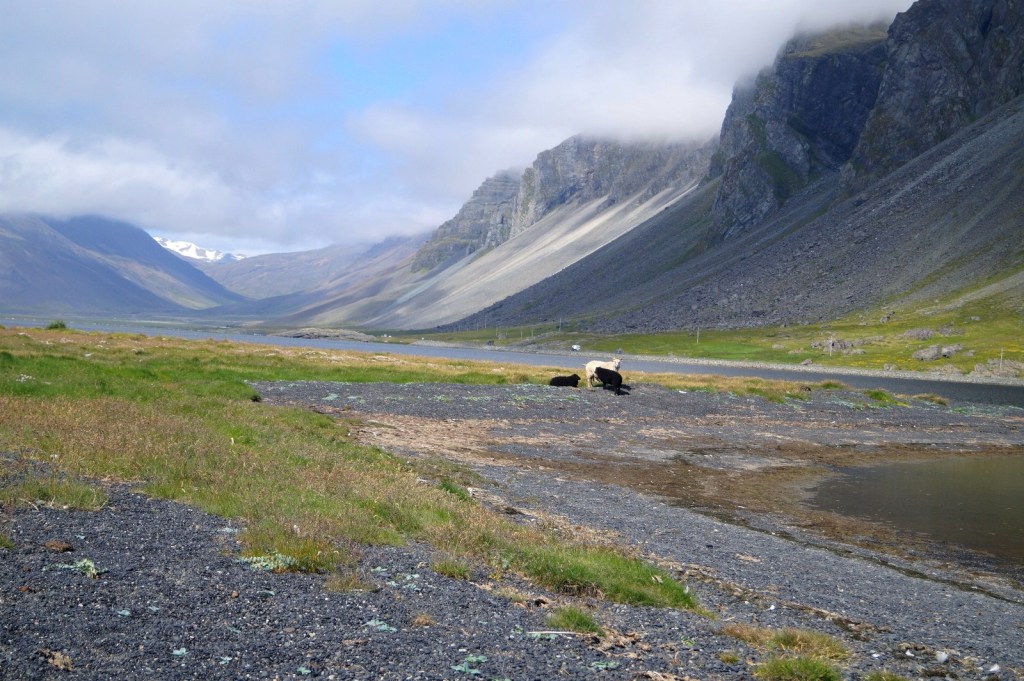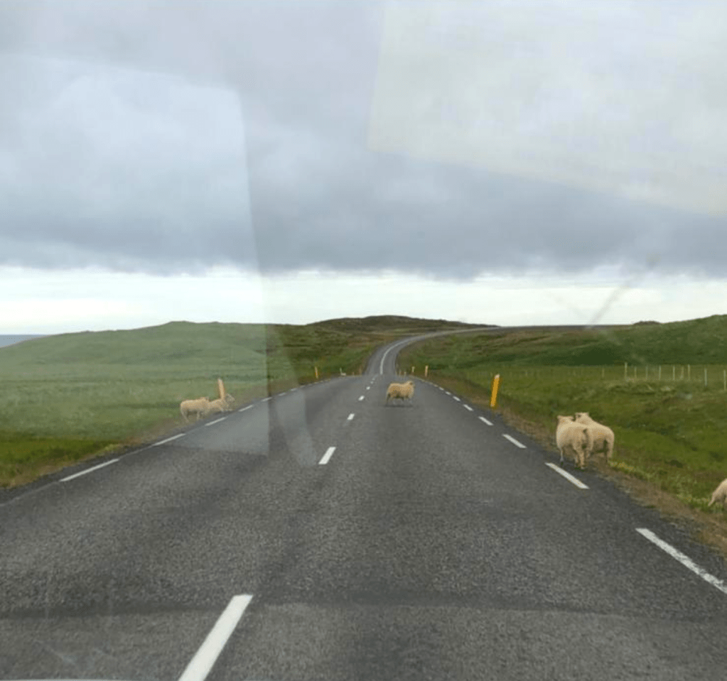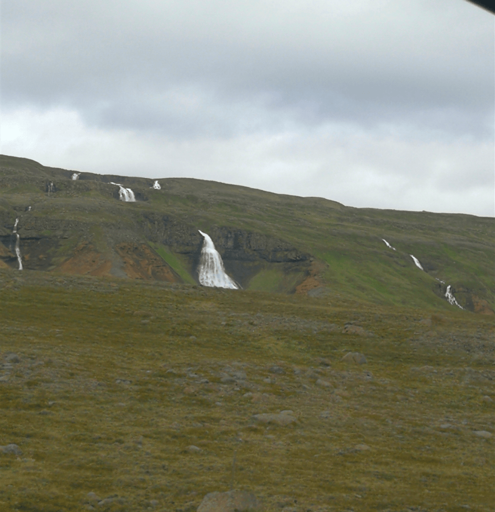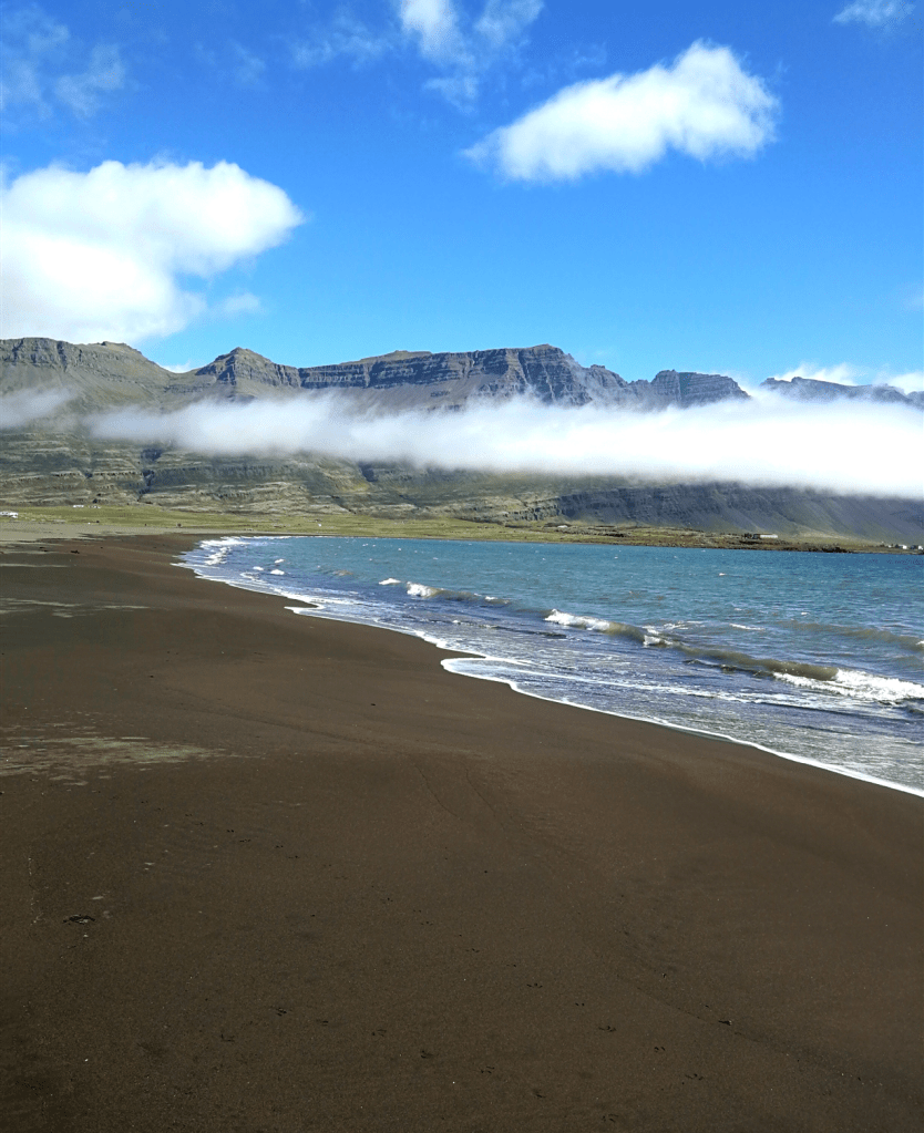 Our day began with a decision to make. Should we drive through the mainland or follow the Ring Road and see more of the coastline straight away? Since we had a great time the first time, we opted for the coastal road again. So, we jumped in the van and set off for the day. The drive turned out to be really scenic and peaceful, as there didn’t seem to be many other drivers around. At least, we didn’t see many cars on the way. The landscape kept changing from hilly to more flat. And all of a sudden a fjord opened up in front of us and we could see the ocean. Even better, the road continued alongside the fjord. We had the ocean on one side and the land on the other. It immediately changed my mood from sad for leaving the north to excited. I wanted to see more. In addition the sun came through the clouds, so it became even more magical. We didn’t really say much while driving because we were just in awe of the view. The road took us into the next little fjord and then out again out on the other side. And driving got even better the further we went. Because, out of nowhere, the road in front of us seemed to go directly through the water. We stopped halfway to get out and have a little walk. We found out that we were on Meleyri Beach. A beach that is covered with black volcanic sand and just seems to go on forever. From three sides it is framed by mountains, which makes the whole place look like an AI-created image. We spent our time here walking along the beach, bird-watching and enjoy the calmness of this place. We were so caught up in the moment that we didn’t even notice the time flying by. When we got back to the car, we couldn’t believe it. It was nearly an hour and a half later! But this stop was worth every second. We carried on driving and the scenery stayed beautiful all the way down to our next stop. Even though you’re just driving and not doing much else, you don’t feel like you’re wasting time. Because you never know what you’re going to see next on these roads and it feels like sightseeing.